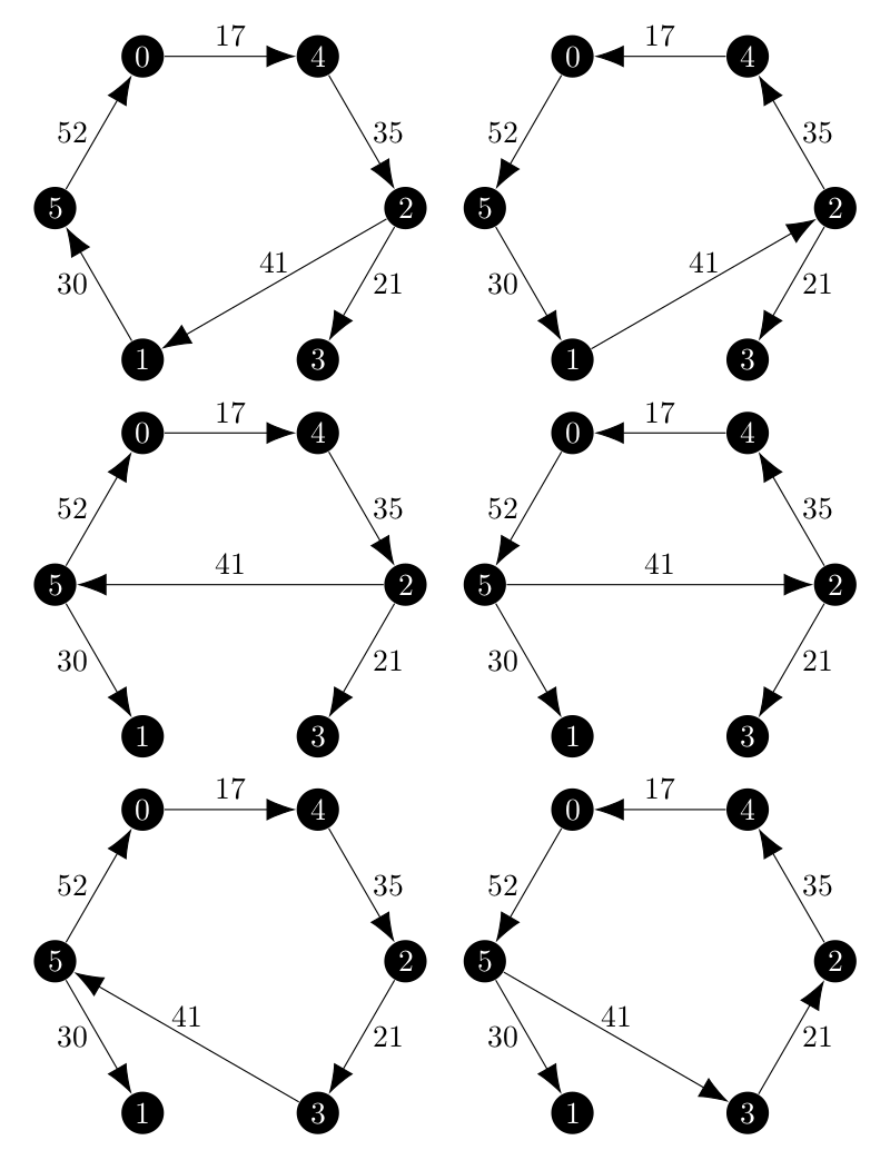 As I mentioned before, the branch and bound method is more human-computable than the ascent method, so I decided to follow the execution of my implementation with the one given in [1]. Below, the left side is the data from the Held and Karp paper and on the right my program’s execution on the directed version.